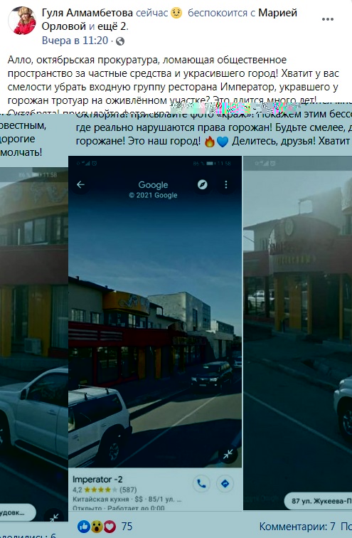 «Октябрьская прокуратура, хватит ли у вас смелости убрать входную группу ресторана «Император», укравшего у горожан тротуар на оживленном участке? Это длится много лет. Жители Октябрьского района, давайте покажем этим бессовестным, где действительно нарушаются права горожан. Будьте смелее, хватит молчать!» — написала на своей странице в Facebook Гуля Алмамбетова.