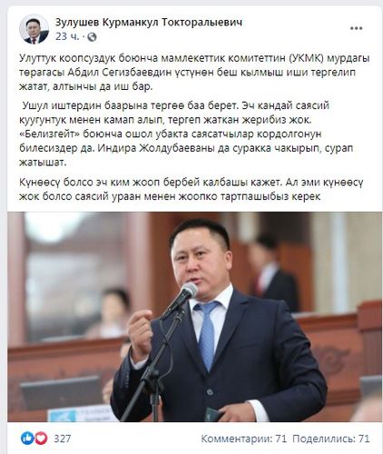 «В отношении экс-главы ГКНБ Абдиля Сегизбаева расследуется шесть уголовных дел. Следствие даст всему юридическую оценку. Никто не арестовывал его по политическим мотивам. Вы знаете, кто злоупотреблял положением по делу о Белизгейте. Индиру Джолдубаеву тоже вызывали на допрос. Все, кто причастен, ответят по закону, а невиновных привлекать не будем», — подчеркнул Курманкул Зулушев.