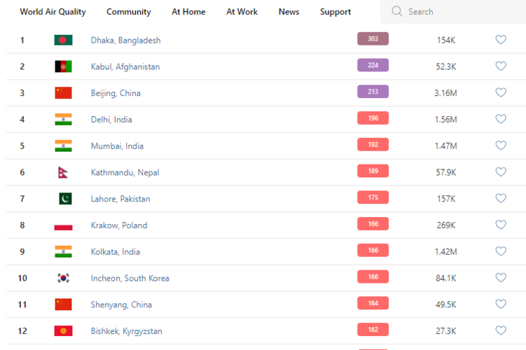 В рейтинге крупнейших городов мира по качеству воздуха World Air Quality Бишкек поднялся на 12-е место.