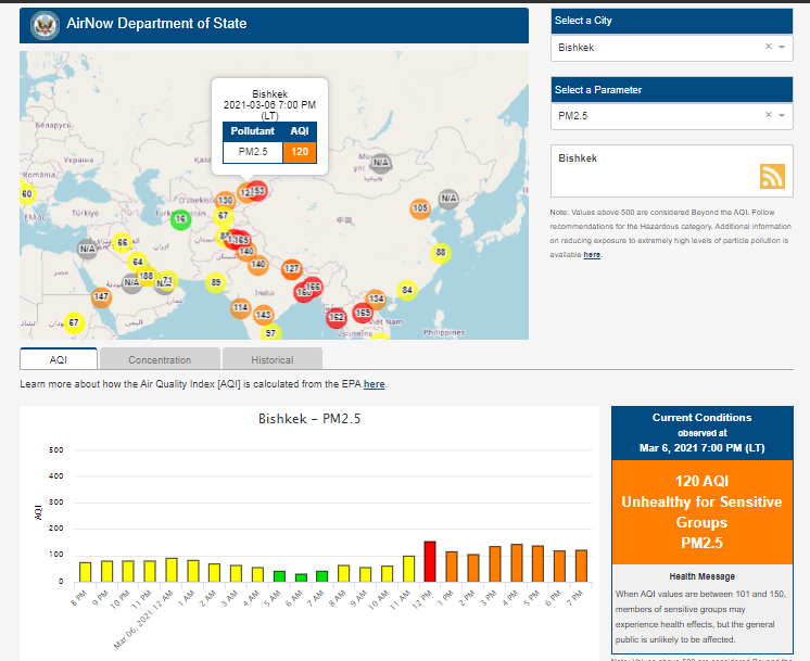 Посольство США в Кыргызстане также установило датчик. Информация обновляется каждый час. На 19.00 индекс качества воздуха в районе дипломатической миссии — 120 (AQI).
