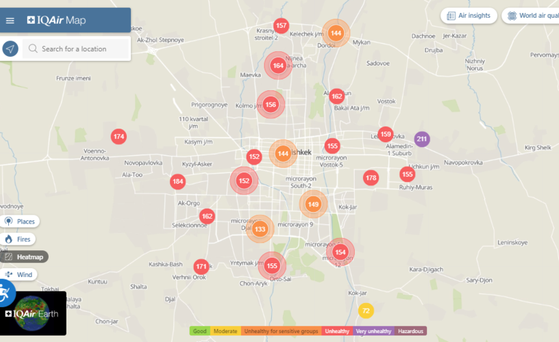 Общественный фонд «Институт экологических решений» установил датчики в столице и пригороде. На карте можно увидеть среднее значение AQI в разных районах Бишкека. Его обновляют ежечасно.