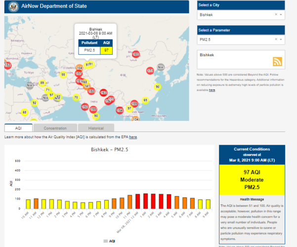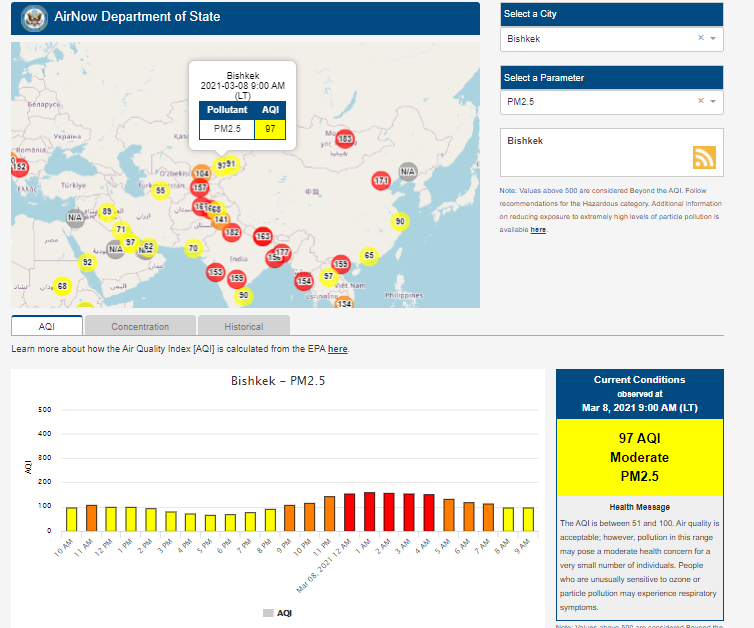 Посольство США в Кыргызстане также установило датчик. Информация обновляется каждый час. На 9.00 индекс качества воздуха в районе дипломатической миссии — 97 (AQI).