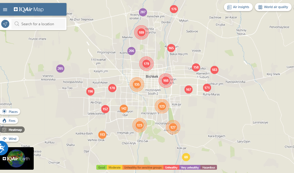 Общественный фонд «Институт экологических решений» установил датчики в столице и пригороде. На карте можно увидеть среднее значение AQI в разных районах Бишкека. Его обновляют ежечасно.