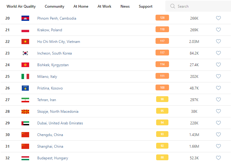 В рейтинге крупнейших городов мира по качеству воздуха World Air Quality Бишкек опустился на 24-е место.