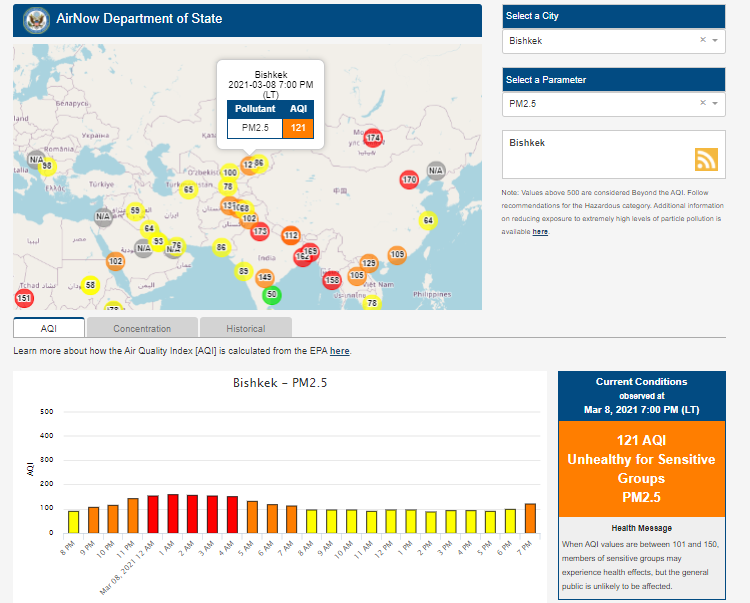 Посольство США в Кыргызстане также установило датчик. Информация обновляется каждый час. На 19.00 индекс качества воздуха в районе дипломатической миссии — 121 (AQI).