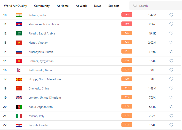 В рейтинге крупнейших городов мира по качеству воздуха World Air Quality Бишкек поднялся на 15-е место.