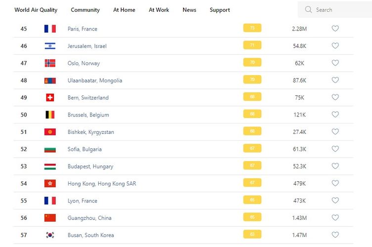 В рейтинге крупнейших городов мира по качеству воздуха World Air Quality Бишкек опустился на 51-е место.