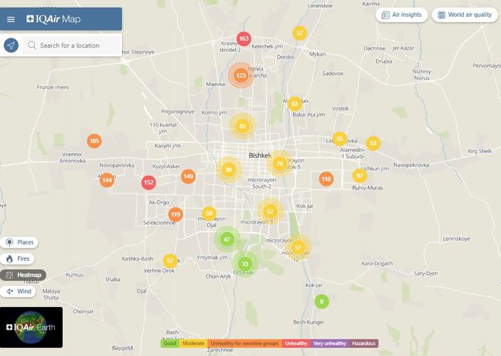 Общественный фонд «Институт экологических решений» установил датчики в столице и пригороде. На карте можно увидеть среднее значение AQI в разных районах Бишкека. Его обновляют ежечасно.