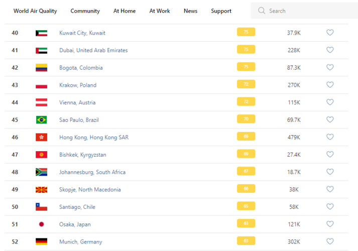 В рейтинге крупнейших городов мира по качеству воздуха World Air Quality Бишкек поднялся на 47-е место.
