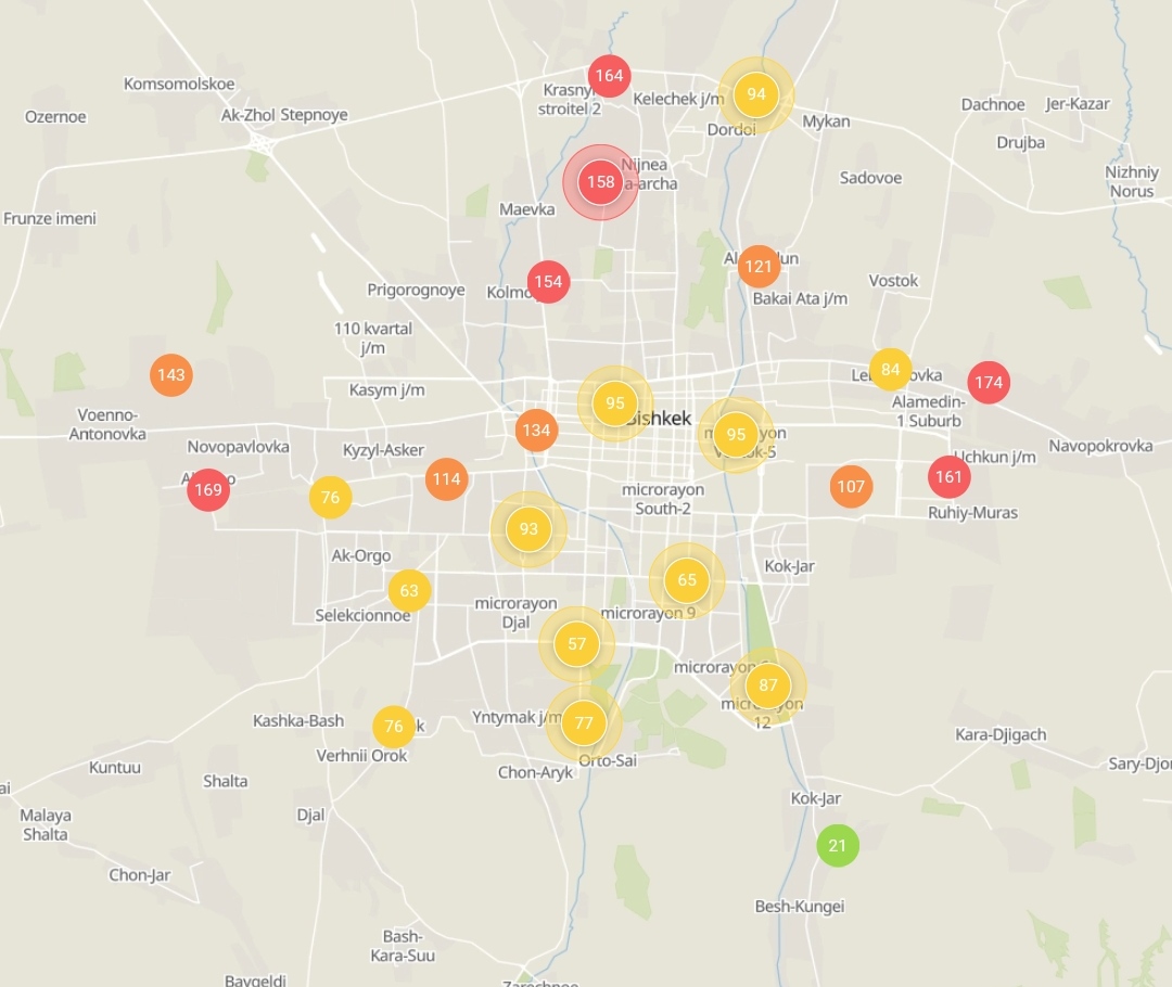 Общественный фонд «Институт экологических решений» установил датчики в столице и пригороде. На карте можно увидеть среднее значение AQI в разных районах Бишкека. Его обновляют ежечасно.