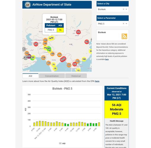 Посольство США в Кыргызстане также установило датчик. Информация обновляется каждый час. На 19.00 индекс качества воздуха в районе дипломатической миссии — 56 (AQI).