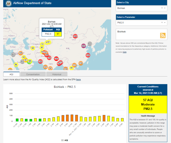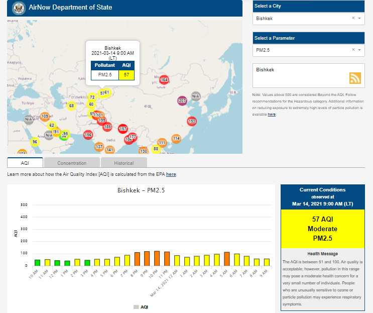 Посольство США в Кыргызстане также установило датчик. Информация обновляется каждый час. На 9.00 индекс качества воздуха в районе дипломатической миссии — 57 (AQI).