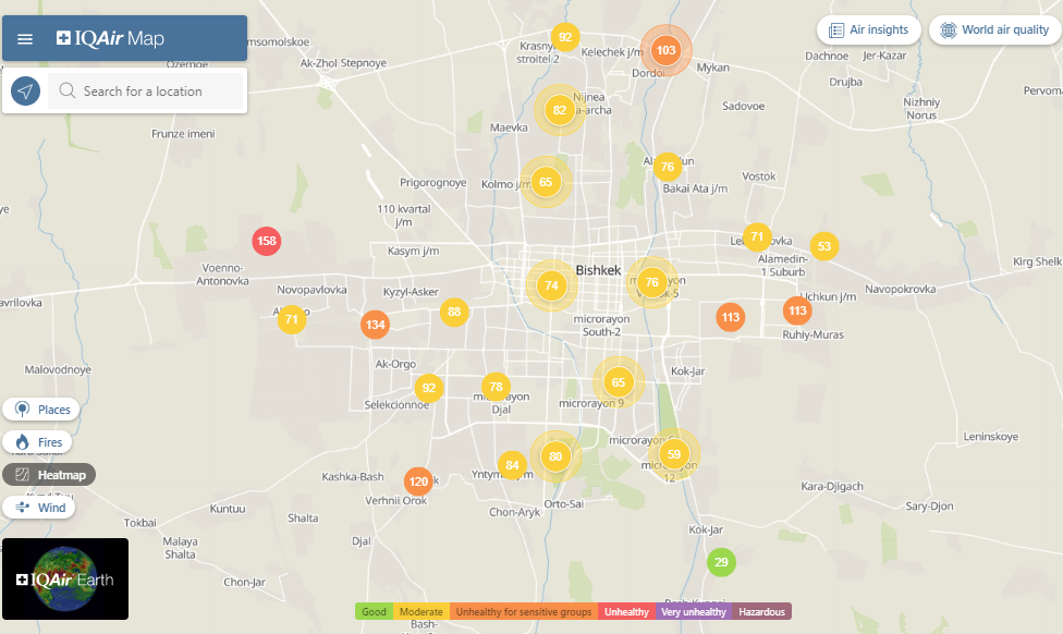 Общественный фонд «Институт экологических решений» установил датчики в столице и пригороде. На карте можно увидеть среднее значение AQI в разных районах Бишкека. Его обновляют ежечасно.