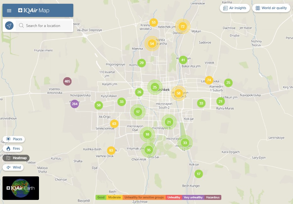 Общественный фонд «Институт экологических решений» установил датчики в столице и пригороде. На карте можно увидеть среднее значение AQI в разных районах Бишкека. Его обновляют ежечасно.