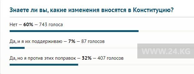 По итогам опроса, в котором приняли участие 1 тысяча 237 человек, выяснилось, что больше половины, а именно 60 процентов (или 743 читателя), не знают, какие изменения вносятся в Основной закон страны. 407 человек, или 32 процента, ответили, что осведомлены о поправках, но будут голосовать против них. И лишь 7 процентов — 87 читателей — готовы поддержать изменения в Конституцию.