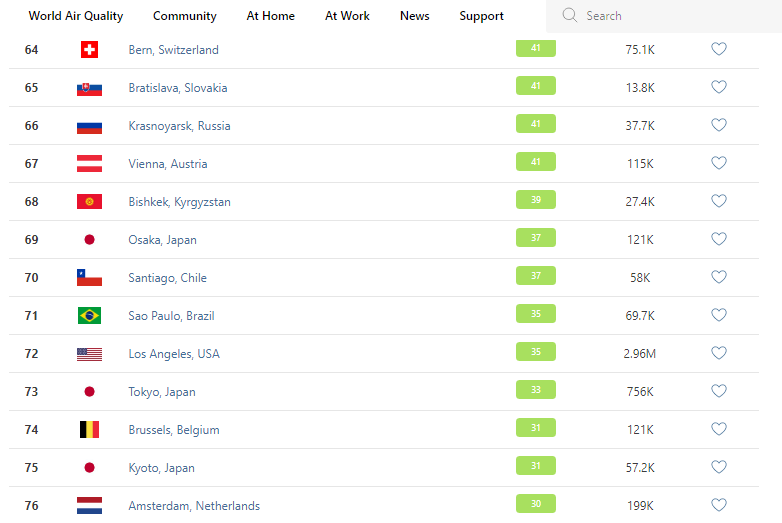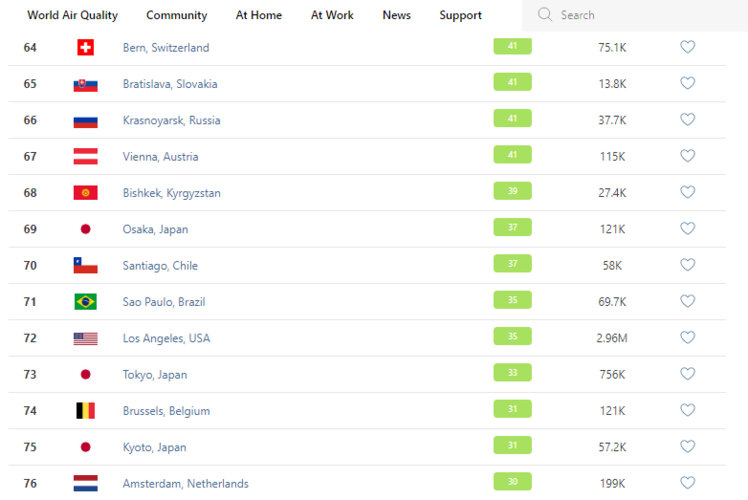 В рейтинге крупнейших городов мира по качеству воздуха World Air Quality Бишкек поднялся на 68-е место.