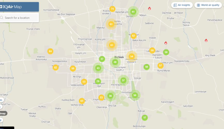 Общественный фонд «Институт экологических решений» установил датчики в столице и пригороде. На карте можно увидеть среднее значение AQI в разных районах Бишкека. Его обновляют ежечасно.