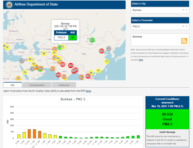Посольство США в Кыргызстане также установило датчик. Информация обновляется каждый час. На 19.00 индекс качества воздуха в районе дипломатической миссии — 48 (AQI).