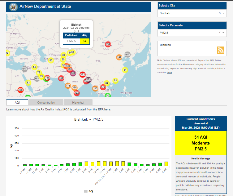 Посольство США в Кыргызстане также установило датчик. Информация обновляется каждый час. На 9.00 индекс качества воздуха в районе дипломатической миссии — 54 (AQI).