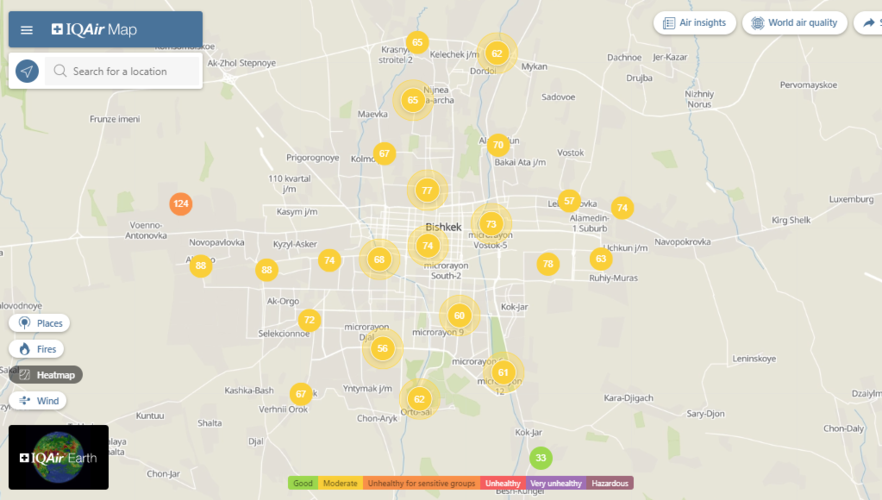 Общественный фонд «Институт экологических решений» установил датчики в столице и пригороде. На карте можно увидеть среднее значение AQI в разных районах Бишкека. Его обновляют ежечасно.