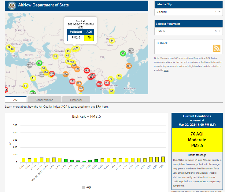 Посольство США в Кыргызстане также установило датчик. Информация обновляется каждый час. На 19.00 индекс качества воздуха в районе дипломатической миссии — 76 (AQI).