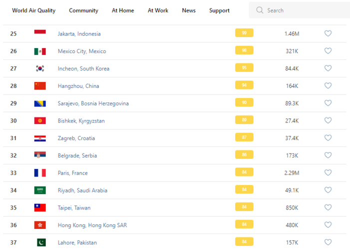 В рейтинге крупнейших городов мира по качеству воздуха World Air Quality Бишкек поднялся на 30-е место.