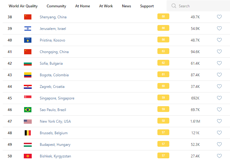 В рейтинге крупнейших городов мира по качеству воздуха World Air Quality Бишкек опустился на 50-е место.