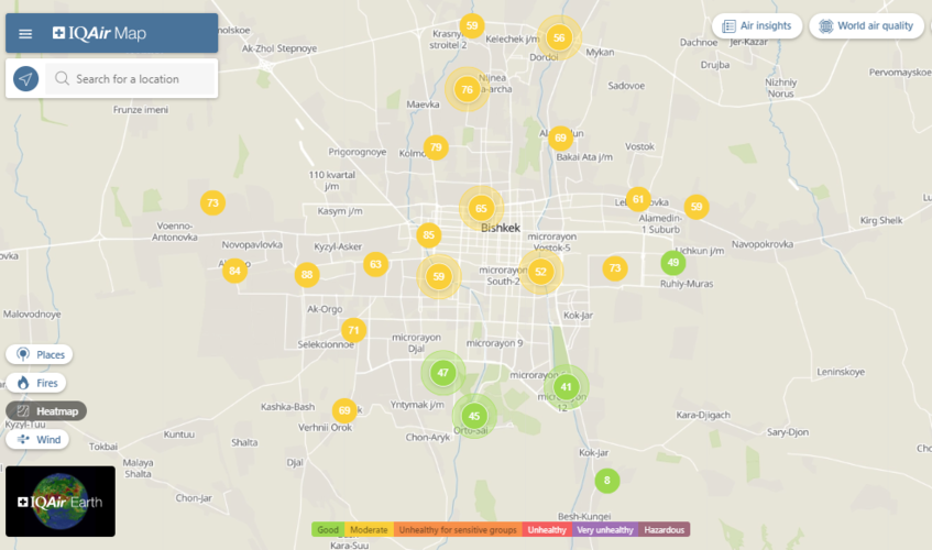 Общественный фонд «Институт экологических решений» установил датчики в столице и пригороде. На карте можно увидеть среднее значение AQI в разных районах Бишкека. Его обновляют ежечасно.