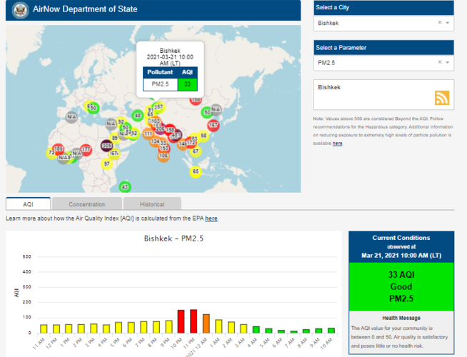 Посольство США в Кыргызстане также установило датчик. Информация обновляется каждый час. На 9.00 индекс качества воздуха в районе дипломатической миссии — 76 (AQI).