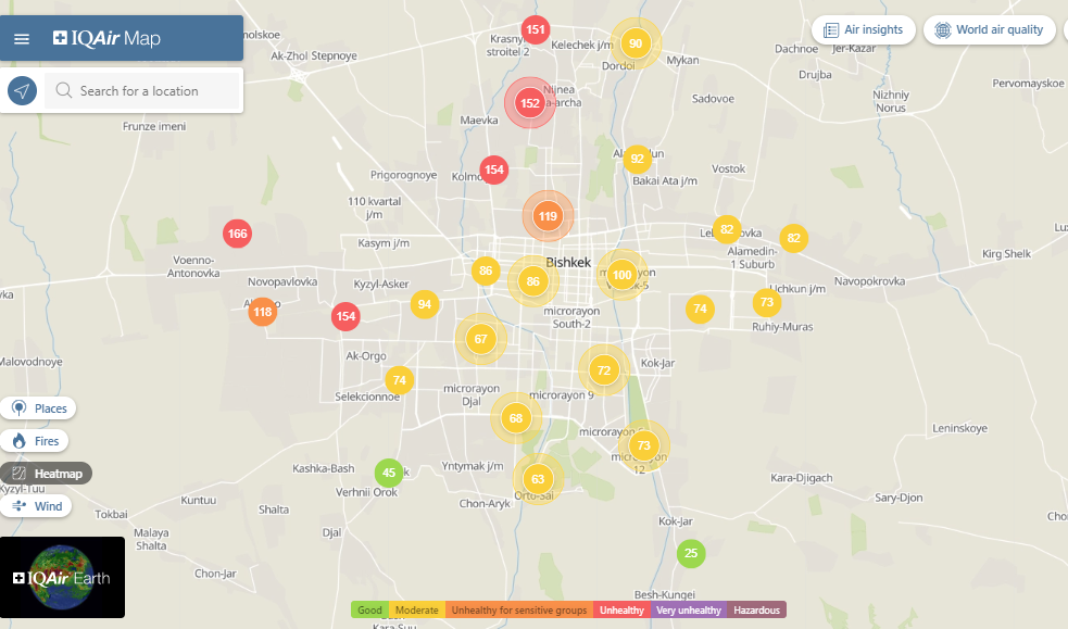 Общественный фонд «Институт экологических решений» установил датчики в столице и пригороде. На карте можно увидеть среднее значение AQI в разных районах Бишкека. Его обновляют ежечасно.