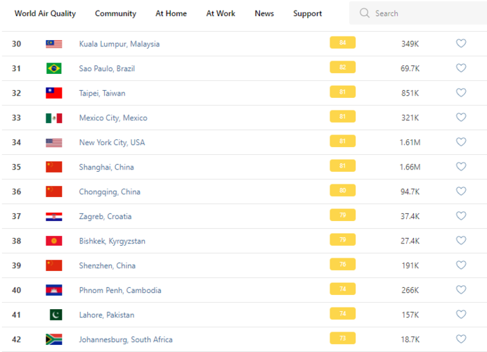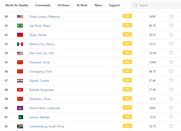 В рейтинге крупнейших городов мира по качеству воздуха World Air Quality Бишкек опустился на 38-е место.