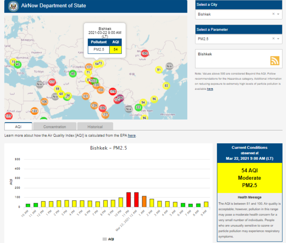 Посольство США в Кыргызстане также установило датчик. Информация обновляется каждый час. На 9.00 индекс качества воздуха в районе дипломатической миссии — 54 (AQI).