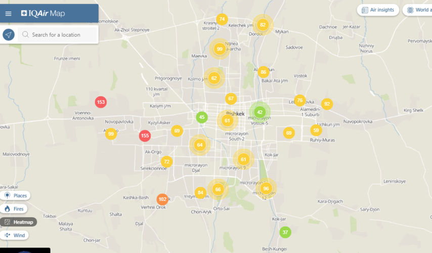 Общественный фонд «Институт экологических решений» установил датчики в столице и пригороде. На карте можно увидеть среднее значение AQI в разных районах Бишкека. Его обновляют ежечасно.