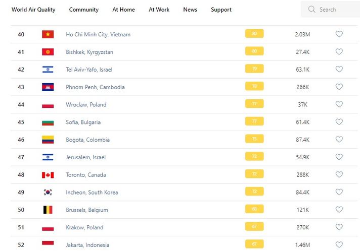В рейтинге крупнейших городов мира по качеству воздуха World Air Quality Бишкек поднялся на 41-е место.