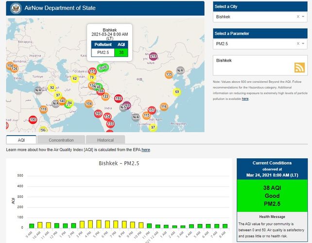 Посольство США в Кыргызстане также установило датчик. Информация обновляется каждый час. На 8.00 индекс качества воздуха в районе дипломатической миссии — 38 (AQI).