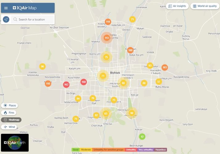 Общественный фонд «Институт экологических решений» установил датчики в столице и пригороде. На карте можно увидеть среднее значение AQI в разных районах Бишкека. Его обновляют ежечасно.