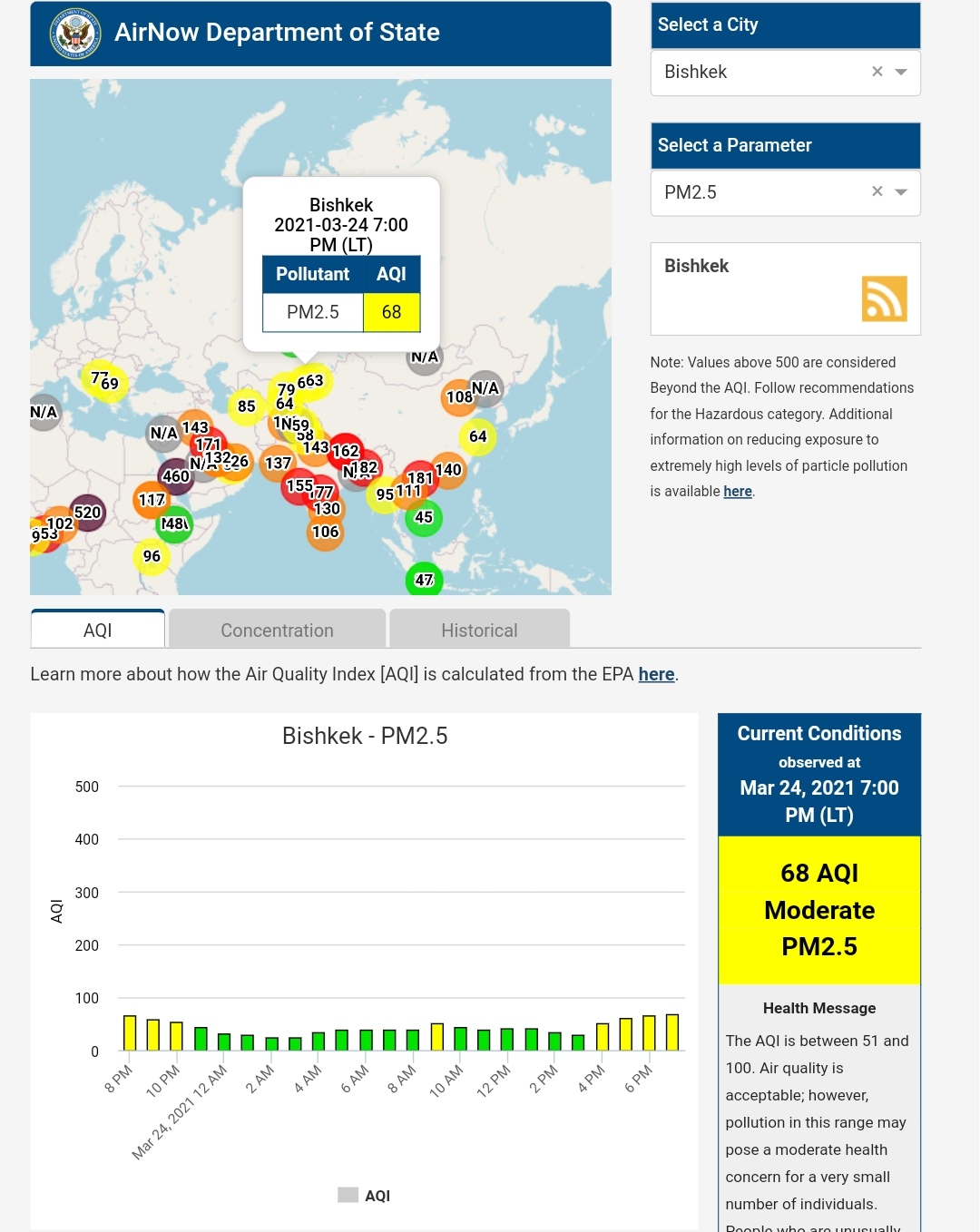 Посольство США в Кыргызстане также установило датчик. Информация обновляется каждый час. На 19.00 индекс качества воздуха в районе дипломатической миссии — 68 (AQI).