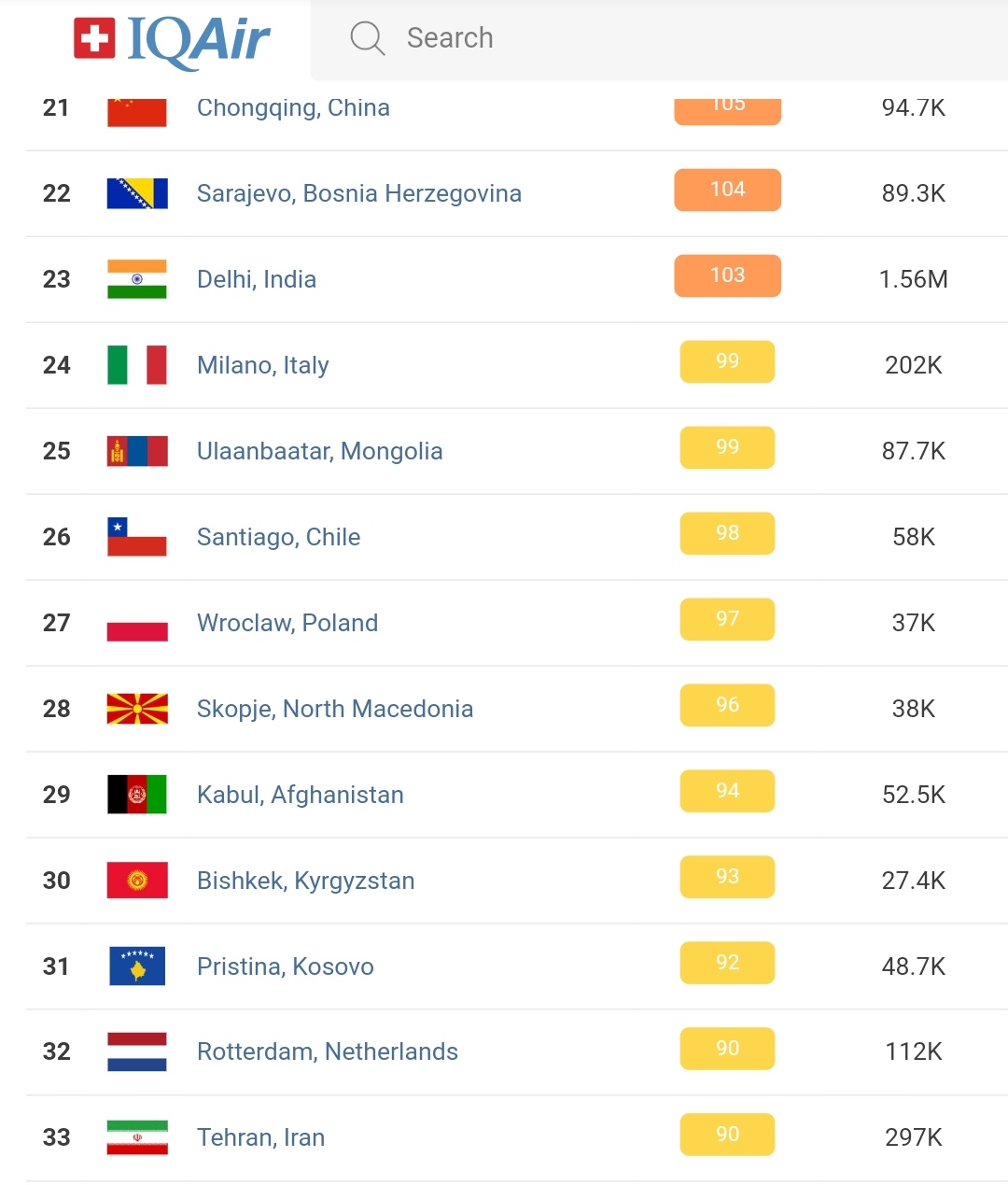 В рейтинге крупнейших городов мира по качеству воздуха World Air Quality Бишкек поднялся на 30-е место.
