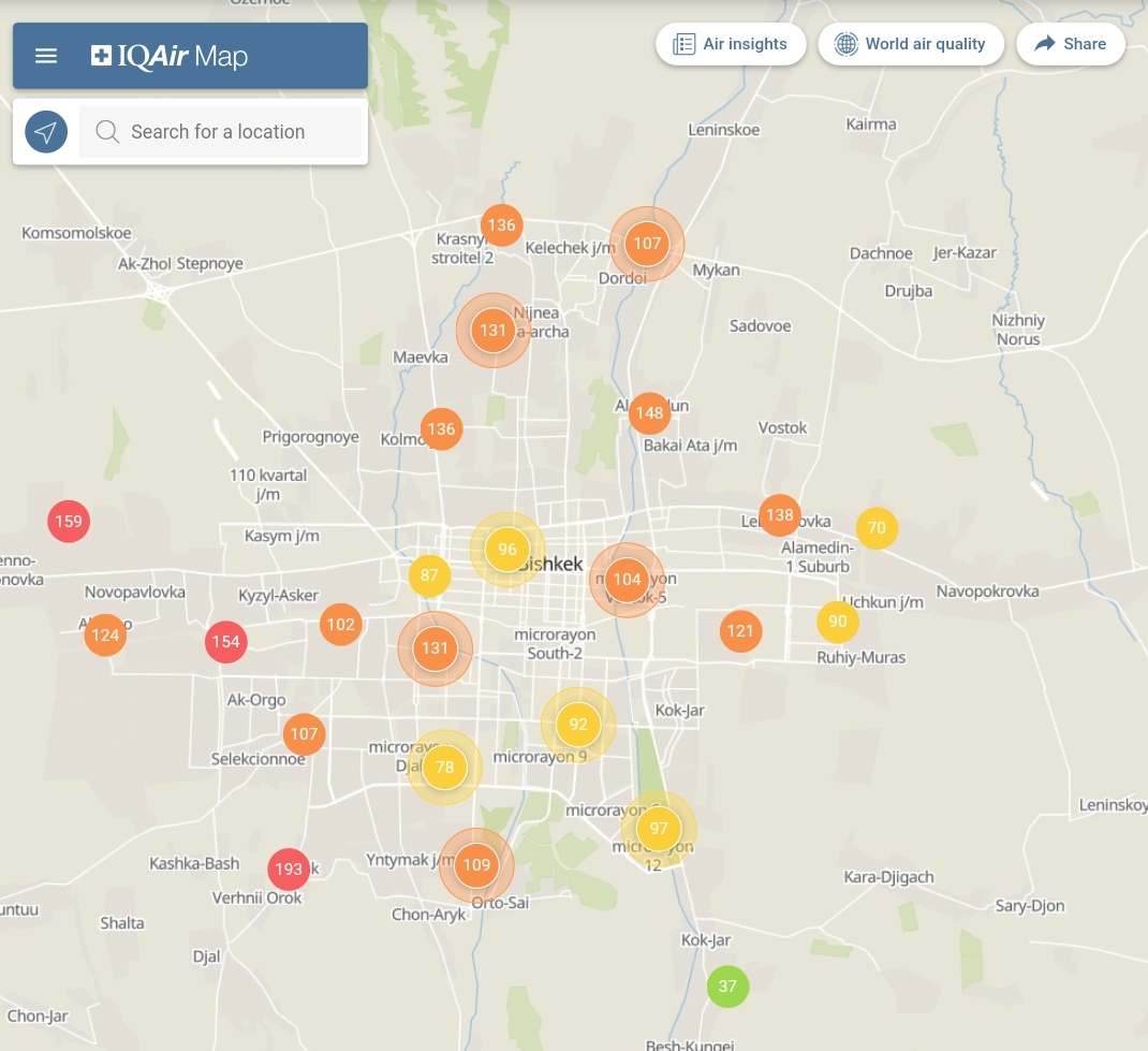 Общественный фонд «Институт экологических решений» установил датчики в столице и пригороде. На карте можно увидеть среднее значение AQI в разных районах Бишкека. Его обновляют ежечасно.