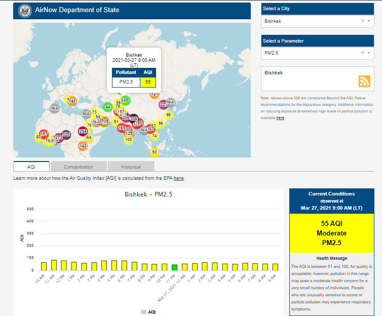 Посольство США в Кыргызстане также установило датчик. Информация обновляется каждый час. На 9.00 индекс качества воздуха в районе дипломатической миссии — 55 (AQI).