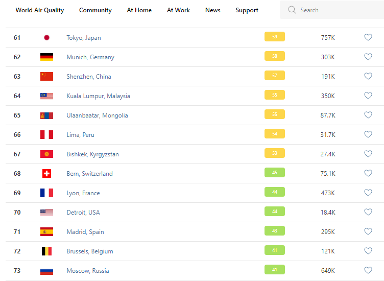 В рейтинге крупнейших городов мира по качеству воздуха World Air Quality Бишкек опустился на 67-е место.