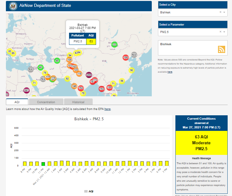 Посольство США в Кыргызстане также установило датчик. Информация обновляется каждый час. На 19.00 индекс качества воздуха в районе дипломатической миссии — 63 (AQI).