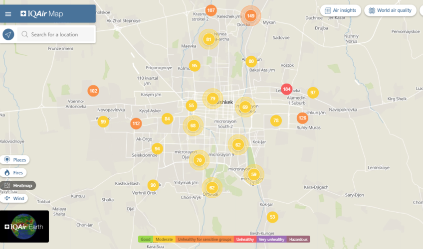 Общественный фонд «Институт экологических решений» установил датчики в столице и пригороде. На карте можно увидеть среднее значение AQI в разных районах Бишкека. Его обновляют ежечасно.