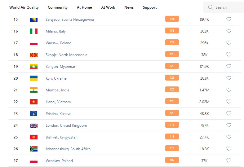 В рейтинге крупнейших городов мира по качеству воздуха World Air Quality Бишкек поднялся на 25-е место.