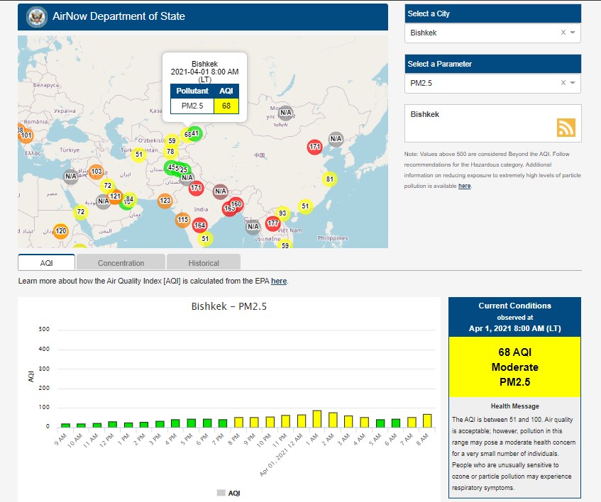 Посольство США в Кыргызстане также установило датчик. Информация обновляется каждый час. На 8.00 индекс качества воздуха в районе дипломатической миссии — 68 (AQI).