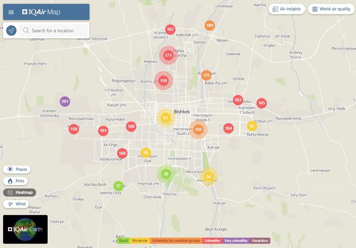 Общественный фонд «Институт экологических решений» установил датчики в столице и пригороде. На карте можно увидеть среднее значение AQI в разных районах Бишкека. Его обновляют ежечасно.