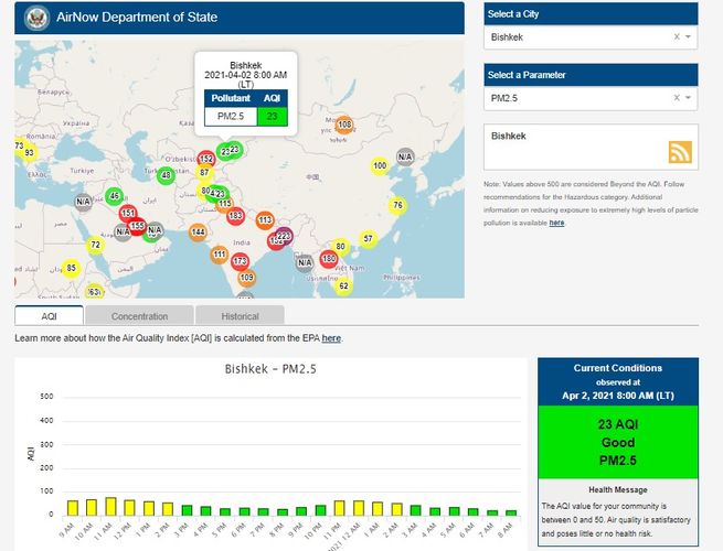 Посольство США в Кыргызстане также установило датчик. Информация обновляется каждый час. На 8.00 индекс качества воздуха в районе дипломатической миссии — 23 (AQI).
