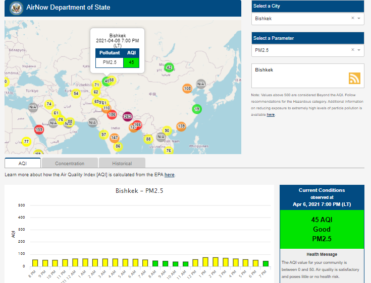 Посольство США в Кыргызстане также установило датчик. Информация обновляется каждый час. На 19.00 индекс качества воздуха в районе дипломатической миссии — 45 (AQI).