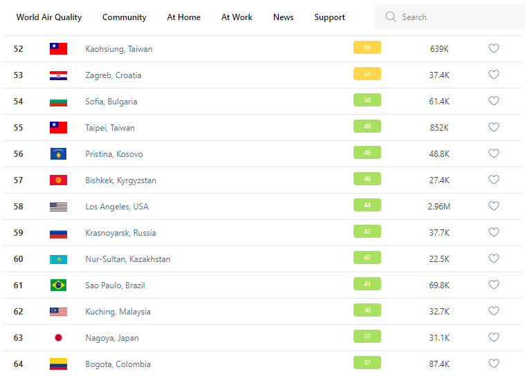 В рейтинге крупнейших городов мира по качеству воздуха World Air Quality Бишкек опустился на 57-е место.