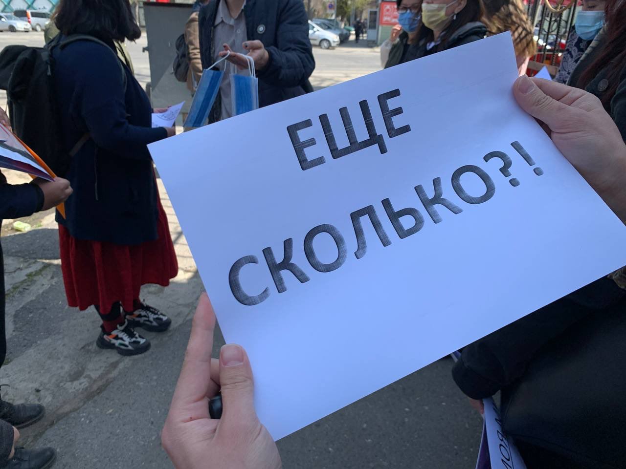 Около 20 человек вышли на акцию протеста. Они держат плакаты «Сколько можно терпеть?» и «Я хочу жить в безопасном государстве».